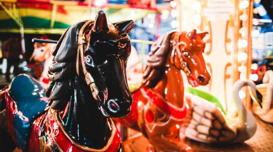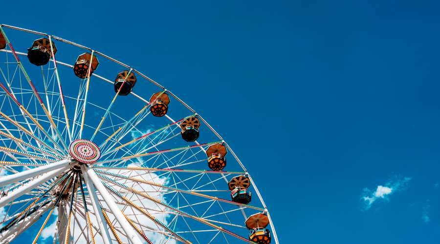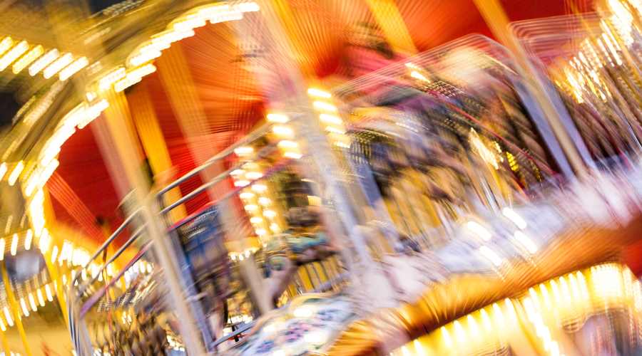 Eine Karussell CSS-Animaton ganz ohne Grafiken erstellt. Sie sehen hier 4 Font-Icons (Gondeln) welche beim Drehen immer in waagerechter Position bleiben. Also ganz so wie beim richtigen Riesenrad. Bei einer einfachen Drehung per CSS-Animation um den Mittelpunkt, würde ja die oberste Gondel, wenn sie sich an unterer Position befindet, auf dem Kopf stehen. Wir mussten uns also dafür eine Lösung ausdenken und haben deshalb mit gleicher Geschwindigkeit alle vier Icons per Block rechts herum und jedes einzelne Icon mit einer zweiten Animation links herum drehen lassen.